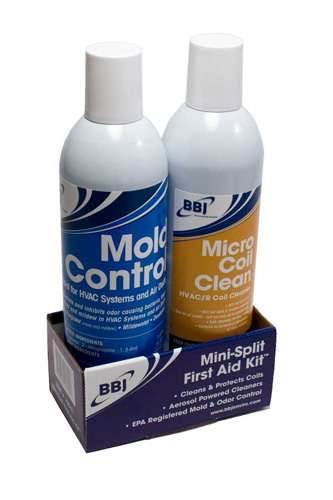 The Mini Split First Aid Kit includes aerosol versions of our popular Micro Coil Clean and BBJ Mold Control for HVAC Systems and Air Duct products. This duo provides the muscle you need for a mini split cleaning job.