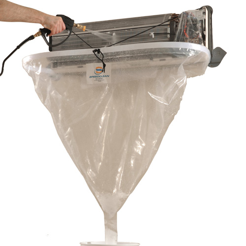The Mini-Split Bib Kit is the fastest way to clean ductless mini-split coils, blower wheels and more. If you are a contractor, you simply have to have one, or two, in your truck. This kit allows you to safely and quickly clean virtually any mini-split system the correct way using pressurized water on coils, blower wheels and more. The patented technology keeps water away from walls and other surroundings and directs it into the 5 gallon bucket for disposal, so it’s clean and safe all around.