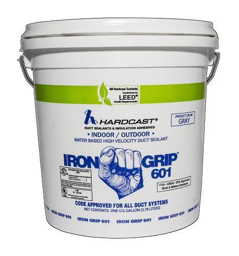 Hardcast Iron-Grip 601 Indoor/Outdoor Fiber Free Gray. Iron-Grip 601 is a versatile, all purpose, fiber-free, duct sealant for use on all types of metal duct, glass fiber duct board, and flex duct, as well as duct fabric and flexible tubing runouts. Distinguished by its ability to accommodate minor vibration and movement, Iron-Grip stays flexible to save call-back labor. Iron-Grip’s excellent coverage rates and easy brush-on application provide low installed cost. Iron-Grip 601 is UL 181 B-M Listed Passes ASTM C-731, ASTM D-2202. USDA, EPA and FDA Approved. LEED compliant SCAQMD Rule 1168. City of Los Angeles Approval RR #8069 10 Year Outdoor Warranty when combined with an AFT-701 combination system.