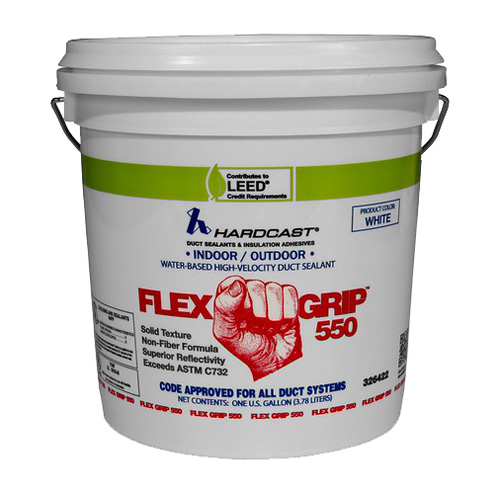 Hardcast Flex-Grip 550 Indoor/Outdoor Fiber Free White. 1 Gallon. Flex-Grip 550 is an all purpose, fiber-free, duct sealant for use on all types of metal duct, glass fiber duct board, and flex duct, as well as duct fabric and flexible tubing runouts. Distinguished by its ability to accommodate minor vibration and movement, Flex-Grip 550 stays flexible to save call-back labor. Flex-Grip 550’s excellent coverage rates and easy brush-on application provide low installed cost. • UL 181 B-M Listed • Passes ASTM C-731, ASTM D-2202 • USDA, EPA and FDA Approved • LEED compliant • SCAQMD Rule 1168 • City of Los Angeles Approval RR #8069
