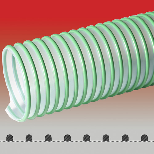 8″ x 25′ Gator Vacuum Hose. 8″ Gator Vacuum Hose is clear and green with polyolefin and polypropylene construction. 8″ Gator hose has an external all plastic helix and a smooth bore. 8″ Gator Hose is ideal for insulation removal, and hooking up in tight spaces for duct cleaning and dryer vent cleaning.
